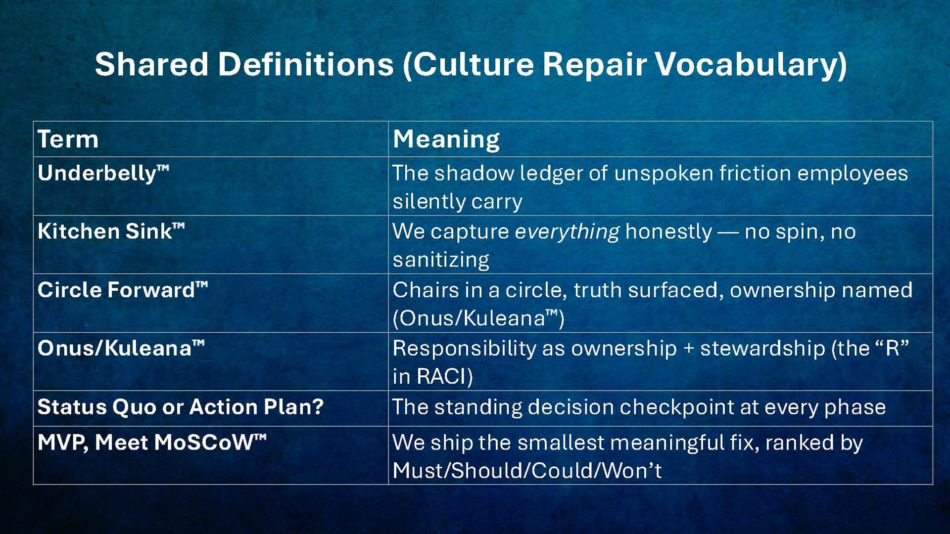 A 90-day corporate culture repair framework that moves teams from awareness → action → visible change.