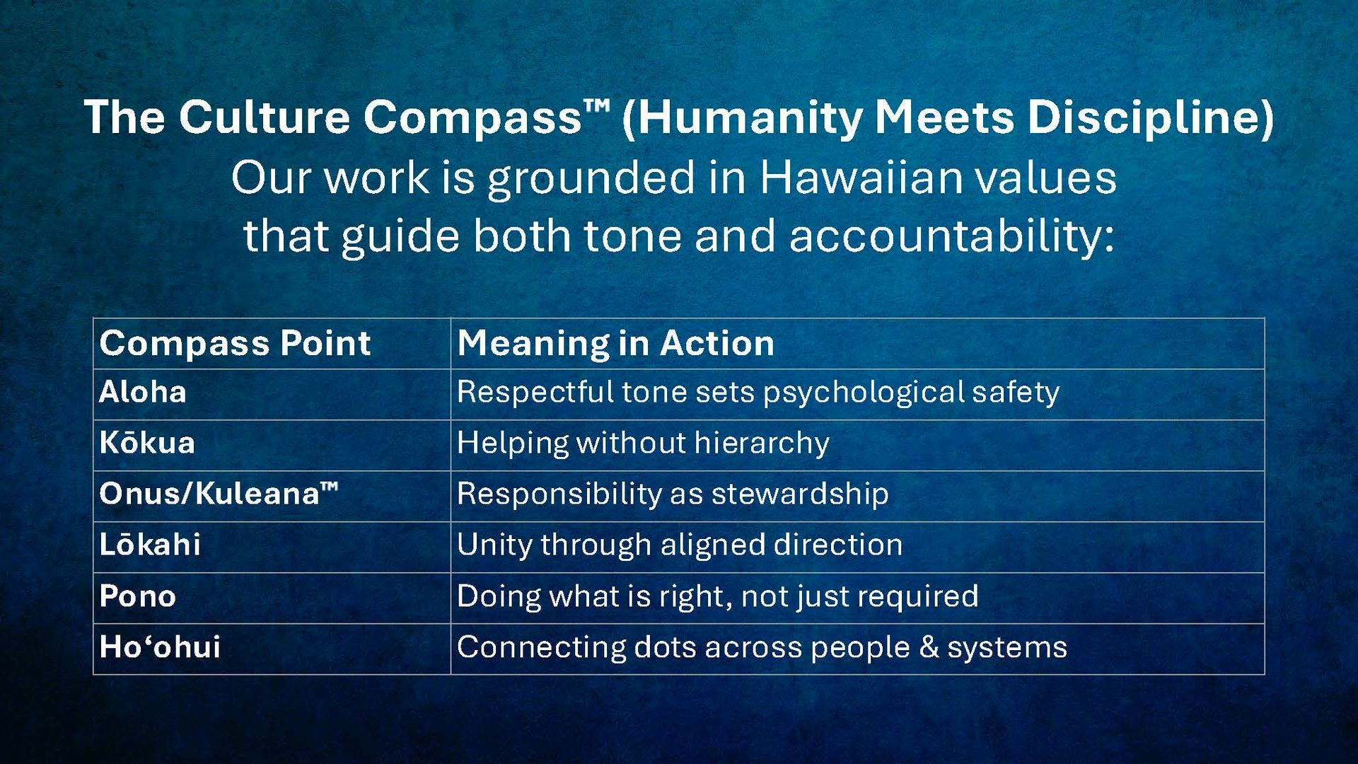 Every engagement blends data and dignity, rigor and reflection—guided by the Hawaiian values that form the Culture Compass™.